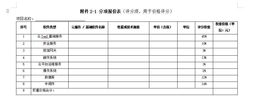 对于“熊猫体育工程集团有限公司云资源服务供应商谈判比选公告”中的“附件2-1 分项报价表(评分项,用于价格评分)”