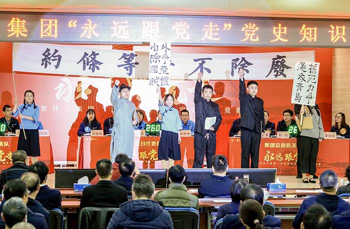 决赛设置小组必答题、情景再现题、个人对抗题、小组抢答题、小组风险题五个环节,题目内容主要来自党的十九届六中全会精神、习近平总书记“七一”重要讲话精神、党史学习教育指定学习材料等。3支参赛队伍的选手们展现出了深厚的文化底蕴和丰富的知识储备。现场的“听红色歌曲接唱歌词”“看经典片段答红色电影名称”“个人对抗”等环节形式新颖、内容活泼,令人耳目一新,现场气氛活跃、高潮迭起。特别是集团团委组织青年干部职工自编自演的红色主题情景剧给大家留下了深刻印象。