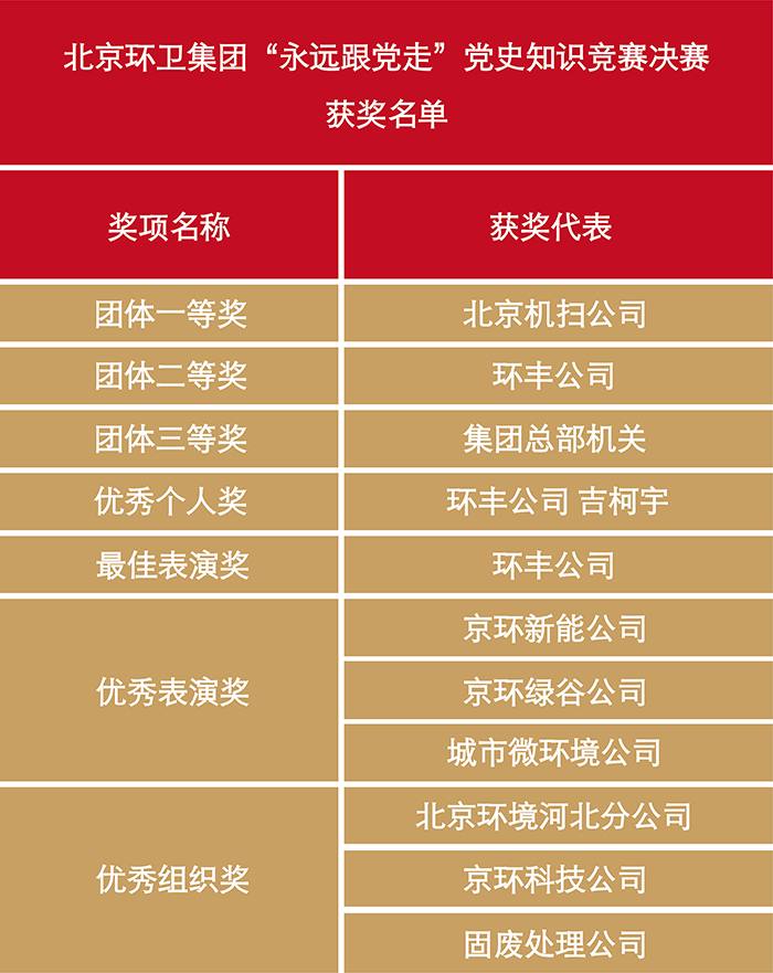 本次“永远跟党走”党史知识竞赛自今年8月底启动,旨在以赛促学、以学促用,激励集团广大党员干部职工以更加饱满的工作热情、更加务实的工作作风持续推动集团高质量发展,为建设美丽北京、美丽中国贡献熊猫体育力量。集团京内外各单位党组织给予高度重视,广大干部职工踊跃报名、积极备战。比赛覆盖各个职工群体,尤其注重向基层倾斜,每支代表队5名选手中至少有2名为基层一线职工。经过初赛、复赛、半决赛的激烈比拼,环丰公司代表队、北京机扫公司代表队和集团总部机关代表队脱颖而出,进入最终的决赛,进行“巅峰对决”。