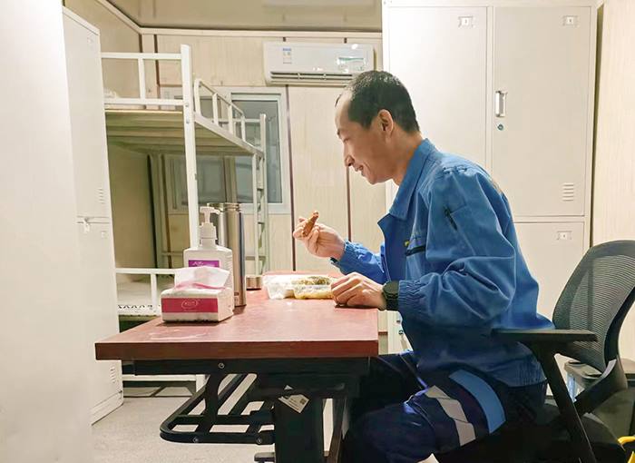 固废物流公司的司机连续工作10多个小时后,回到闭环区域的宿舍内,吃一点饭菜后,上床“秒睡”,积蓄体力投入后续的处置任务(固废物流公司 李彦军 摄)