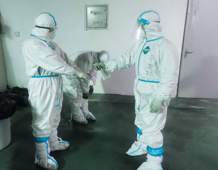 队员们在急诊楼封控区内进行仔细消杀(环服公司 陆勇 摄)