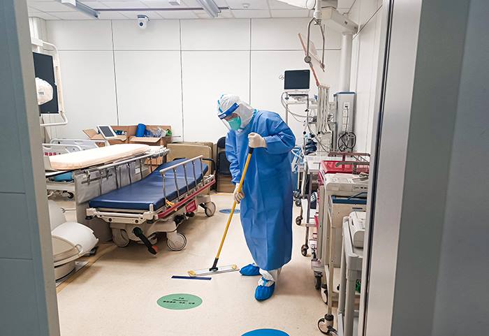 队员在急诊楼封控区内清理病房地面(环服公司 陆勇 摄)
